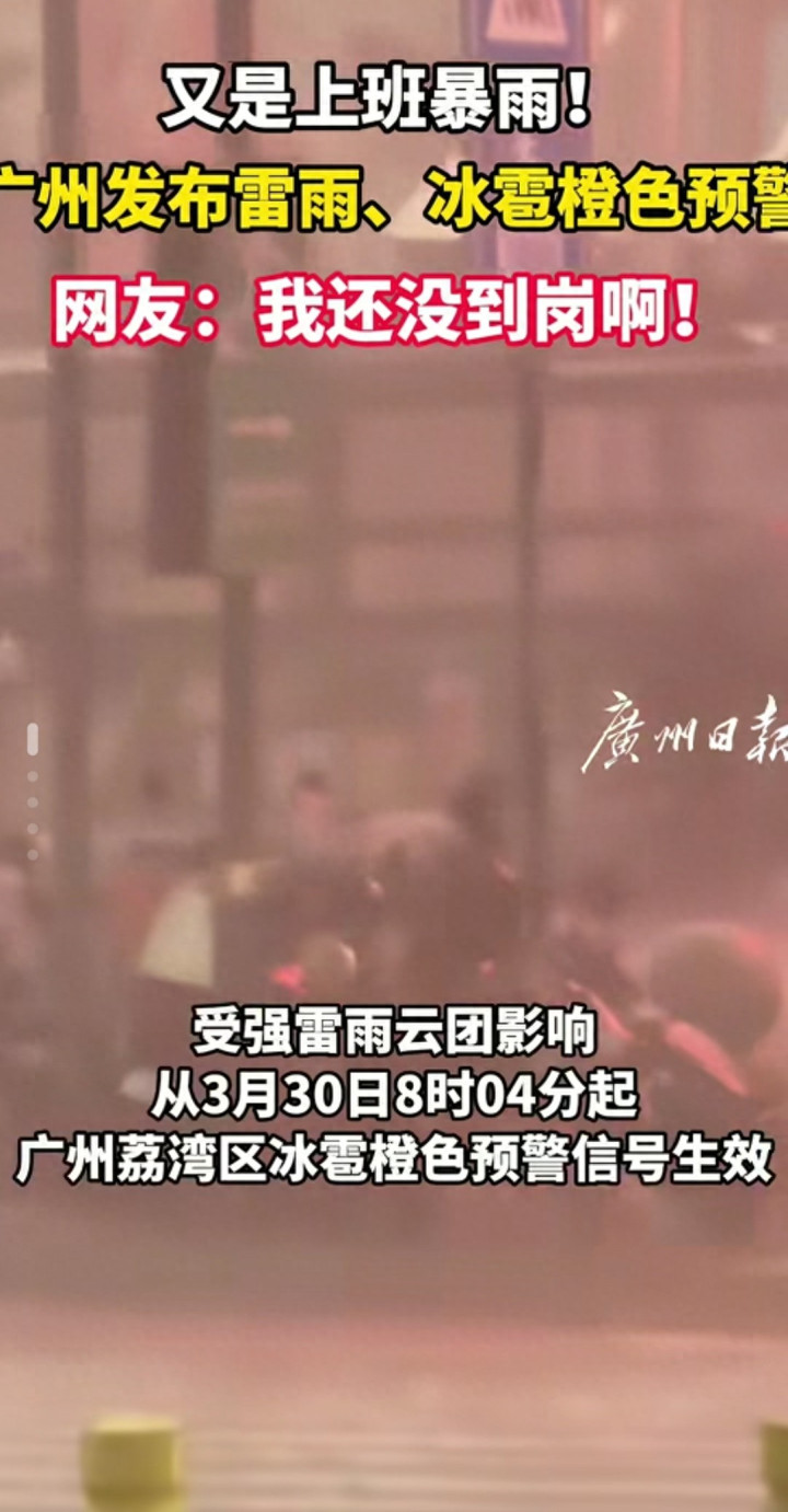 今天(3月30日)一早,广州东说念主的一又友圈被暴雨、冰雹、倒树刷了屏。恰恰周一早岑岭,一场大领域强对流天气一刹杀到,全市多区皆发冰雹、雷雨大风预警,径直把上班路酿成了“历险记”。