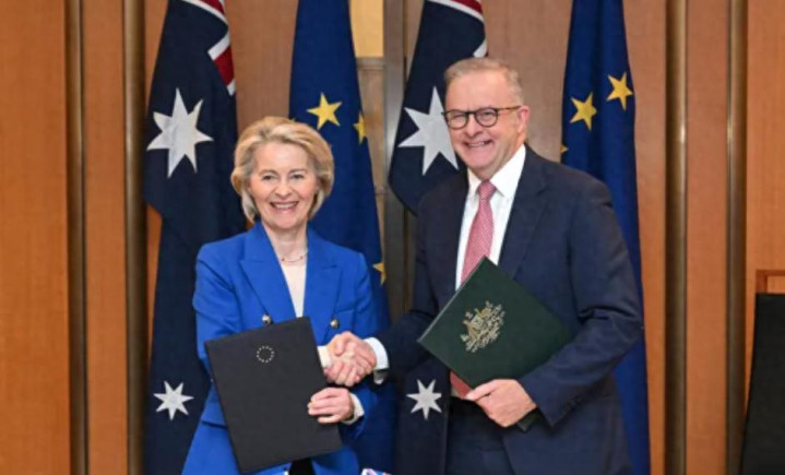 欧盟委员会主席乌尔苏拉·冯德莱恩周二暗示,这项历时八年达成的契约意味着欧盟和澳大利亚“正在走得更近”。
