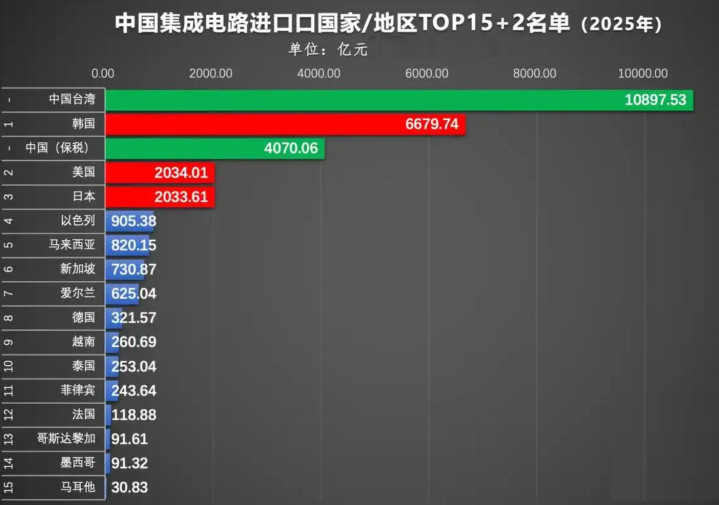 先上数据,这是2025年字据海关数据整理出来的,分国度和地区的芯片进口开头地金额名次。