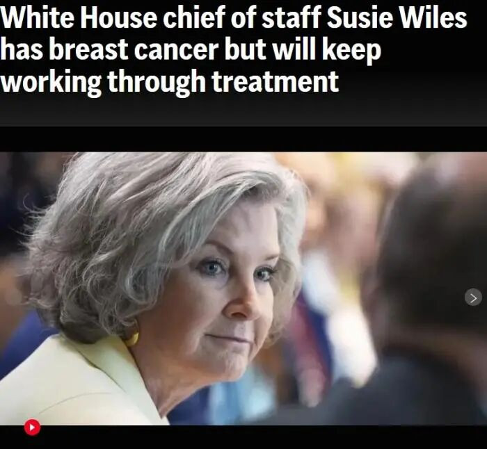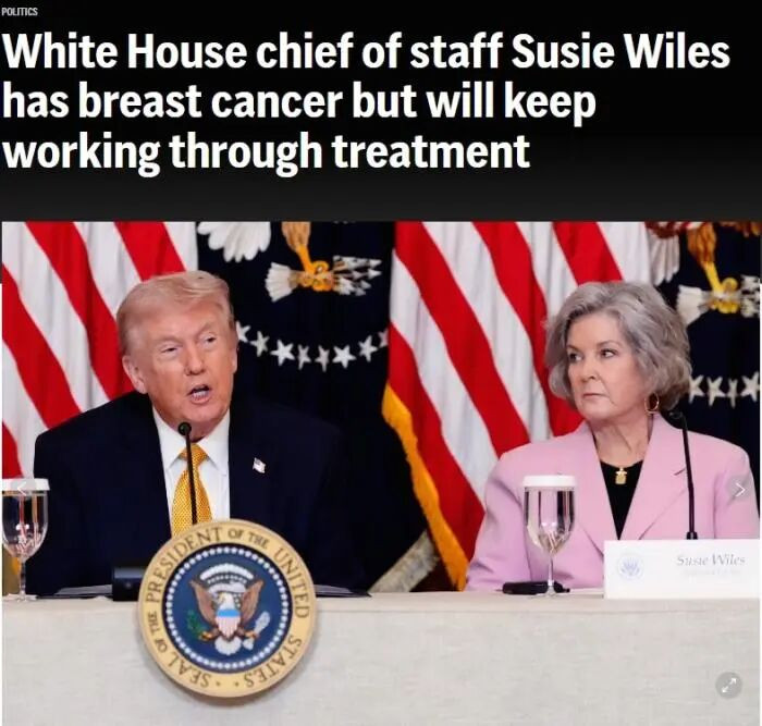 据中新网详细报谈,当地时刻16日,好意思国白宫幕僚长苏珊·怀尔斯默示,她被会诊出患有早期乳腺癌,并很快将在华盛顿地区领受为期数周的治愈。同期她也默示,将继续使命。