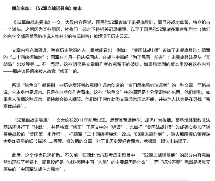 第三,对比多个正规历史账号内容,均以“凭险据守、浴血奋战”为中枢,由此可判断筹商野史为假。