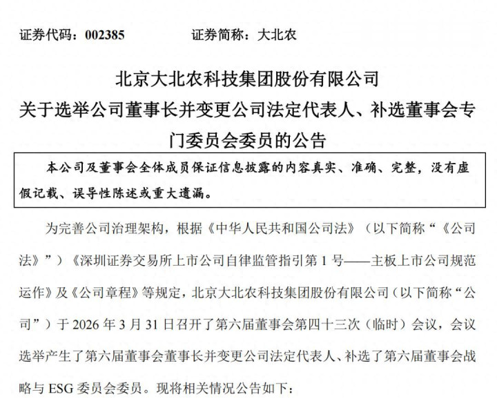 北京大败农科技集团股份有限公司于2026年3月31日发布公告,露出大败农已于面前召开了第六届董事会第四十三次(临时)会议,会议选举莫云女士为第六届董事会董事长,代表奉行公司事务,并担任公司法定代表东谈主,任期自第六届董事会第四十三次(临时)会议决议通过之日起至第六届董事会任期届满之日止。