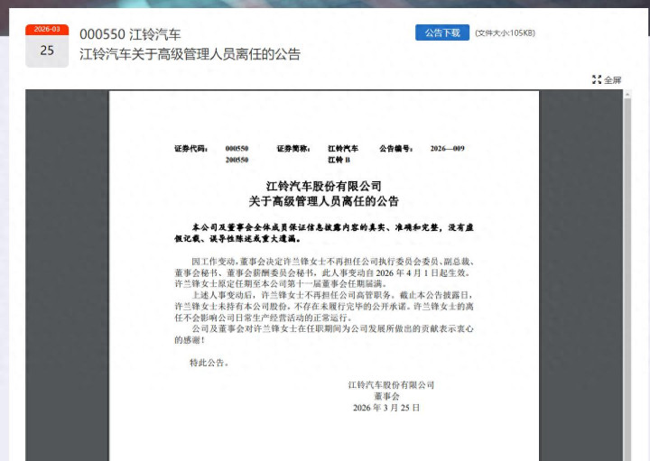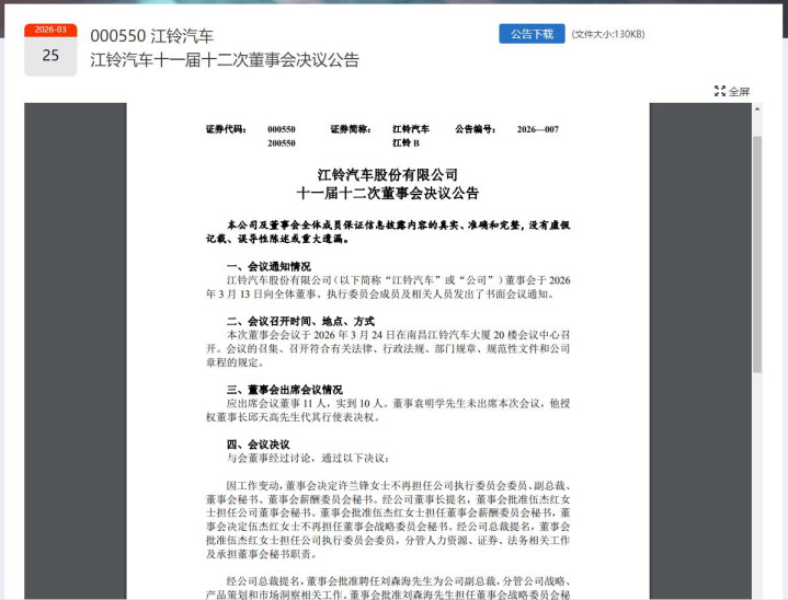 3月25日,江铃汽车股份有限公司(以下简称“江铃汽车”)发布董事会方案公告,露馅了一系列要津岗亭的东说念主事变动。据公司十一届十二次董事会会议方案,因使命变动,许兰锋女士将不再担任公司扩充委员会委员、副总裁及董事会布告等职务;与此同期,普及伍杰红女士接任董事会布告,并聘请刘森海先生为公司副总裁。上述移动将于2026年4月1日进展顺利。