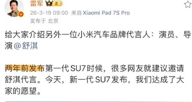3月19日,发布会后的采访体式,一个破坏却耐东说念主寻味的发问被抛出:“为什么找舒淇代言新一代SU7?”雷军的谜底,无意揭晓了一场高出两年的互联网“许诺”若何照进执行。他坦言,取舍体验者代言旨在破圈,而机会恰是两年前那场由网友自觉掀翻的谐音梗狂欢——“舒淇便是SU7”。